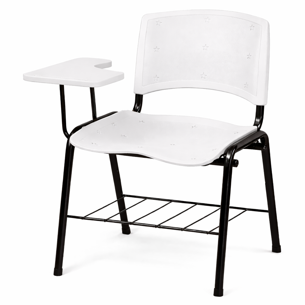 Material: Base montável no AÇO carbono ABNT1020 reforçado com tubos oblongos e redondos 30x16 mm, espessura 1,50 mm com pintura eletrostática, assento e encosto em polipropileno e prancheta em polipropileno.