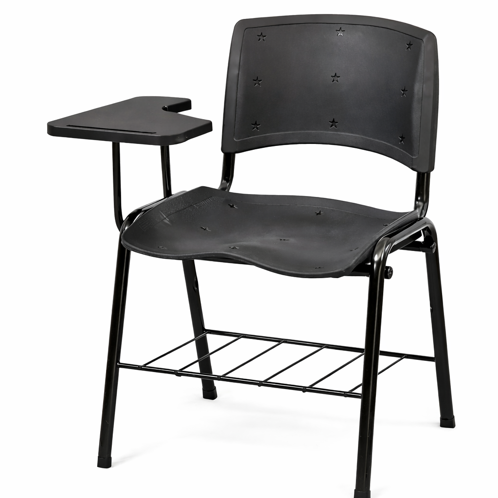 Material: Base montável no AÇO carbono ABNT1020 reforçado com tubos oblongos e redondos 30x16 mm, espessura 1,50 mm com pintura eletrostática, assento e encosto em polipropileno e prancheta em polipropileno.