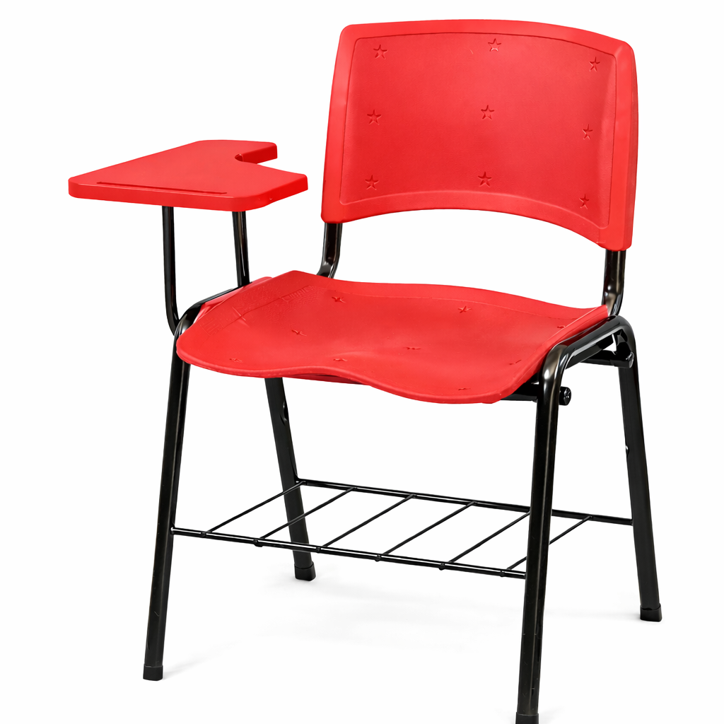 Material: Base montável no AÇO carbono ABNT1020 reforçado com tubos oblongos e redondos 30x16 mm, espessura 1,50 mm com pintura eletrostática, assento e encosto em polipropileno e prancheta em polipropileno.